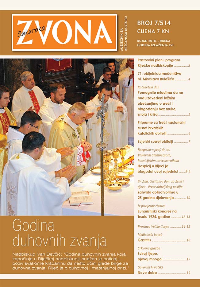 Novi broj mjesečnika Zvona potražite u crkvama Riječke nadbiskupije i Gospićko-senjske biskupije kao i Nadbiskupskom ordinarijatu u Rijeci. Također, Zvona možete pročitati i na priloženom linku: Zvona 2018 7
