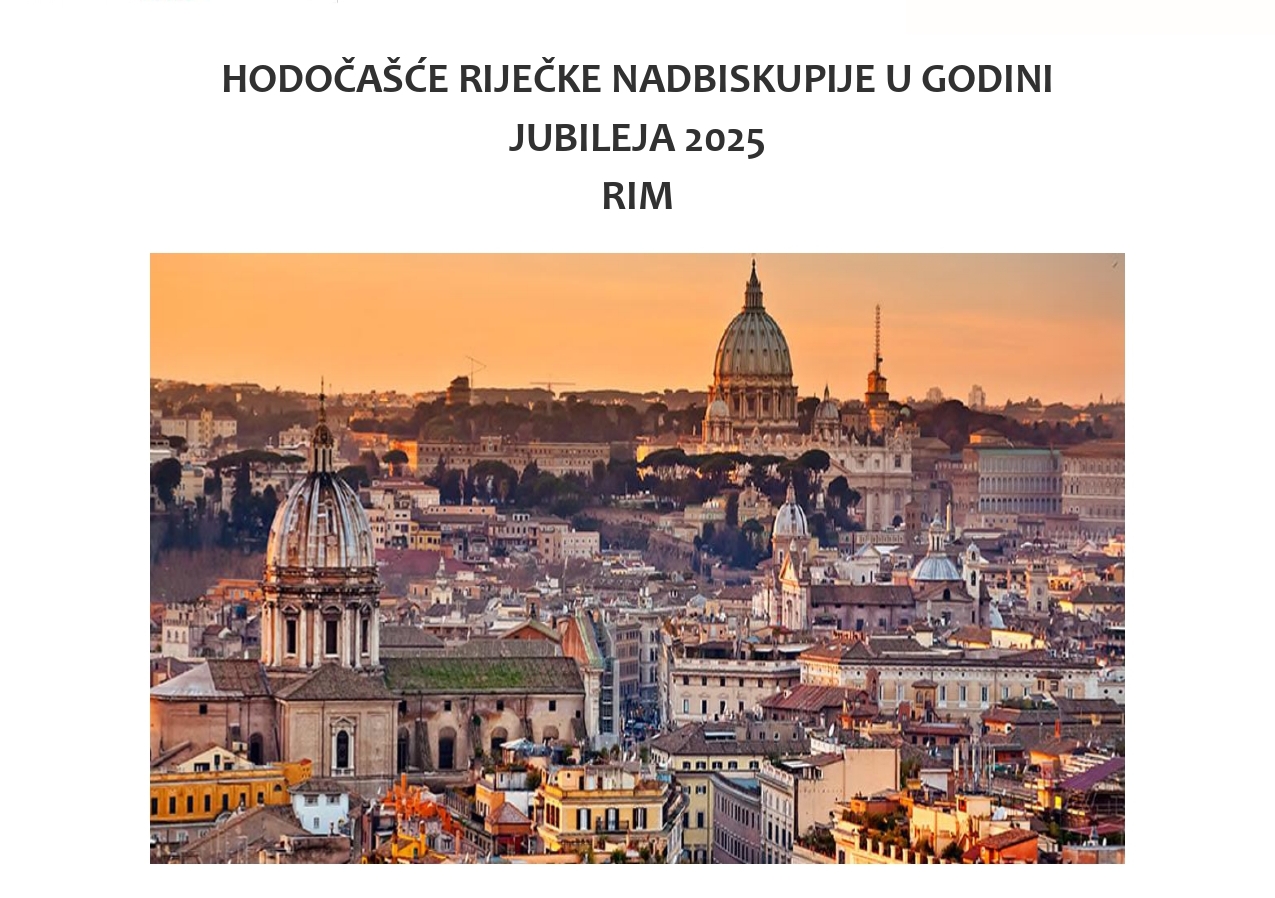 Riječka nadbiskupija, u sklopu nacionalnog hodočašća u godini Jubileja 2025., organizira  od 6 do 11. listopada 2025. hodočašće u Rim. Tijekom hodočašća vjernici će sudjelovati na audijenciji kod Svetoga Oca, a posjetit će i Pisu te Assisi. Cijena hodočašća je 635 Eura, a zainteresirani se mogu prijaviti i sve dodatne informacije dobiti kod svojih župnika.
