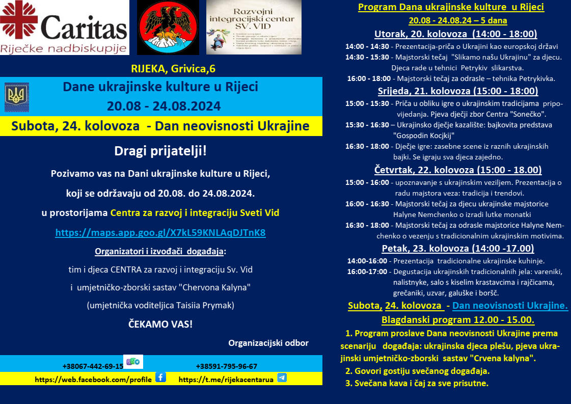 U povodu obilježavanja Dana neovisnosti Ukrajine, Centra za razvoj i integraciju Sv. Vid, osnovan 2023. godine na inicijativu i uz potporu Caritasa Riječke nadbiskupije, u suradnji  s ukrajinskom zajednicom u Rijeci i uz podršku Grada Rijeke, od 20. do 24. kolovoza organizira Dane ukrajinske kulture.
