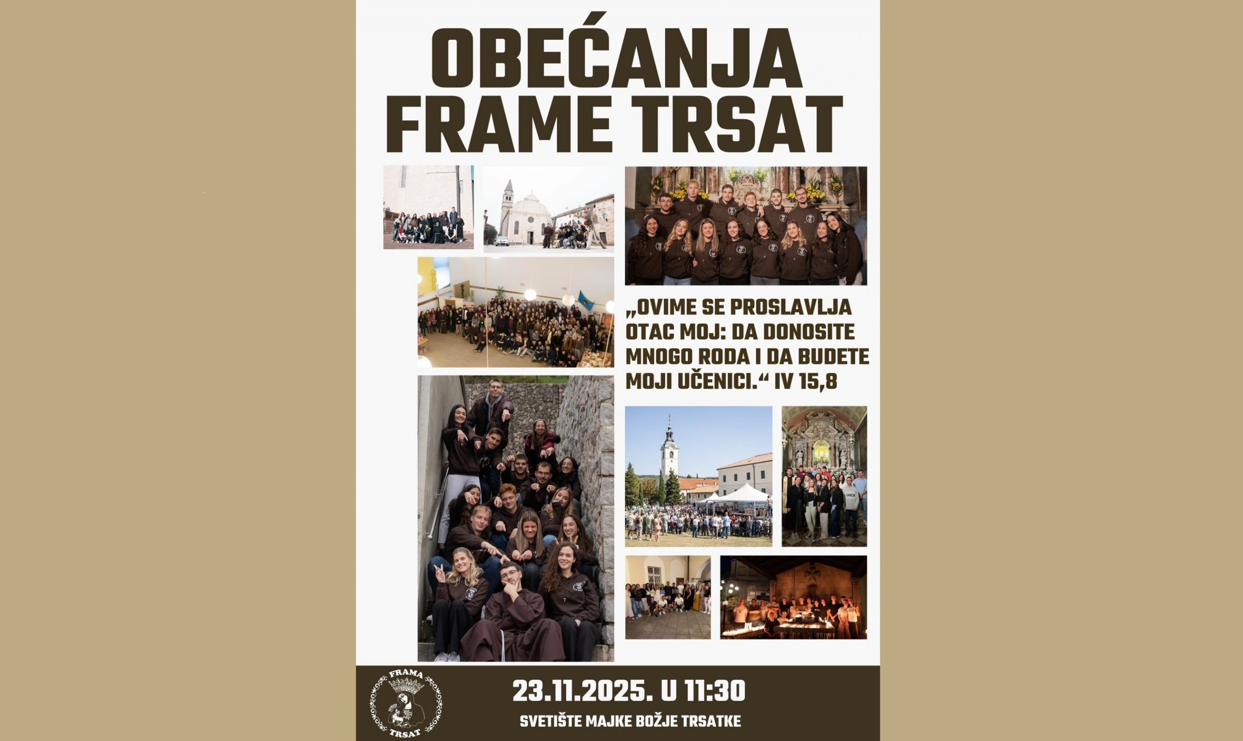 Članovi Frame na Trsatu, u nedjelju 23. studenog, pod misom u 11.30 u bazilici Gospe Trsatske ponovit će ili prvi put položiti svoja obećanja da će živjeti evanđelje Isusa Krista nadahnjujući se karizmom sv. Franje Asiškog, u mjesnom bratstvu franjevačke mladeži Trsat.