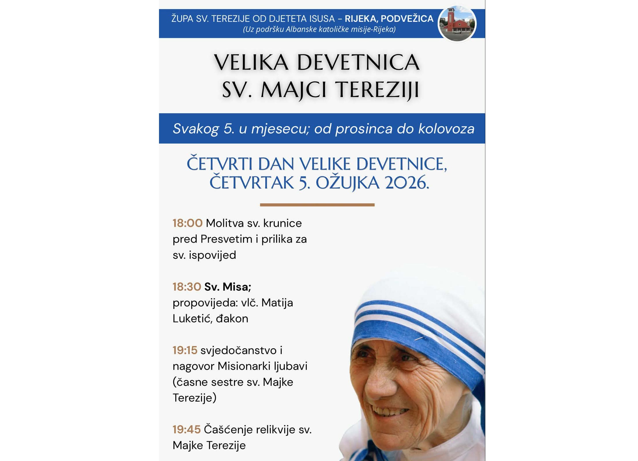 Velika devetnica sv. Majci Tereziji u župi sv. Terezije od Djeteta Isusa – Rijeka, Podvežica, uz podršku Albanske katoličke misije-Rijeka, moli se svakog 5. u mjesecu, a započela je u prosincu.