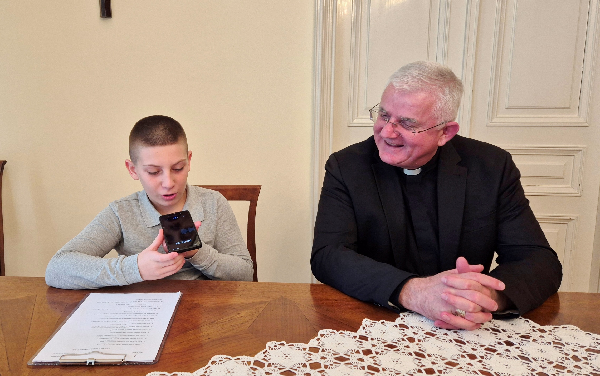 Nadbiskup Mate Uzinić srdačno je i s osmijehom odgovarao na sva pitanja, pokazujući veliko razumijevanje i otvorenost prema mladim sugovornicima. Susret je protekao u veselom i opuštenom ozračju, a mladi novinari iz Nadbiskupskog doma ponijeli su vrijedno iskustvo i lijepe uspomene.